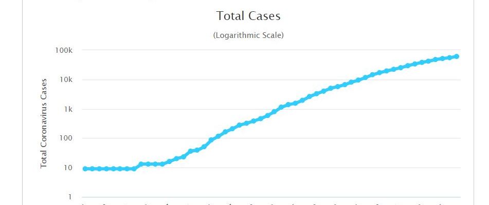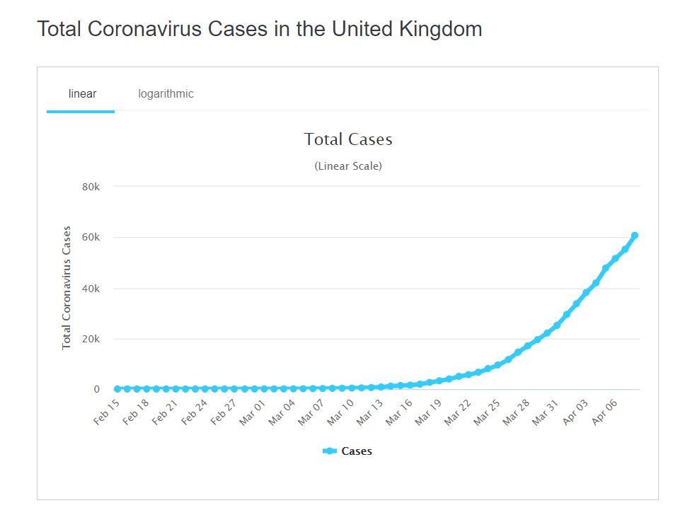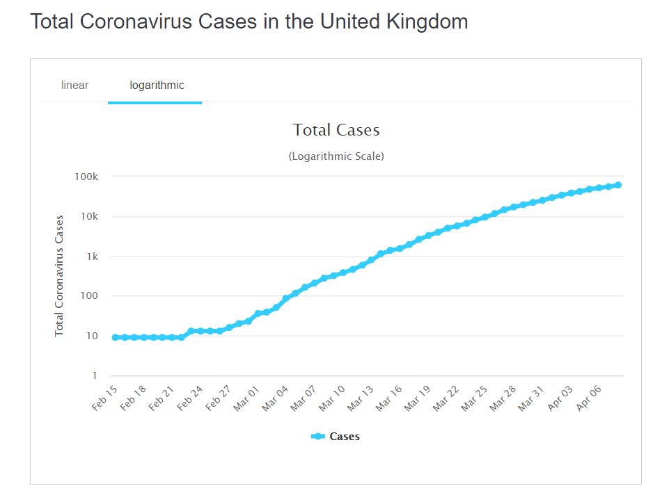 This looks great. Active cases of CV-19 have plateaued. Well done everyone for following the Government’s advice, cases have almost peaked. But a closer look at the Y-axis points out that the chart is using a logarithmic scale. And there are many reasons for doing this. For a start it helps with large numbers that would send data points off the page in no time at all.