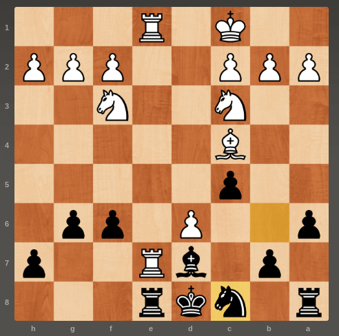 After an initial pawn push down the middle from white, I was having real problems. White’s rooks were lined up on the E file to attack my king. Even worse, the pawn on D6 was a real checkmate threat. In short, white was pretty confident on the win. Then I foundNC6! White’s pawn is hanging. And by that, I mean it’s undefended. He probably didn’t need to convert it to a Queen to kill me off, but it will fall next move. I’ll probably lose my night, but he’ll lose at least one rook. This move changed my whole day!